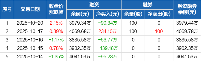 严牌股份:融资净偿还90.34万元,融资余额3979.34万元(10-20)