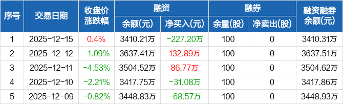 严牌股份:融资净偿还227.2万元,融资余额3410.21万元(12-15)