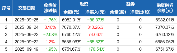 百胜智能:融资净偿还88.37万元,融资余额6982.01万元(09-25)