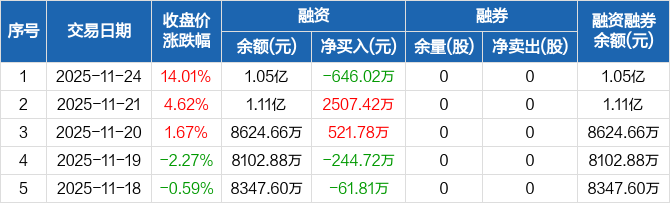 百胜智能融资融券信息显示,2025年11月24日融资净偿还646.02万元;融资余额1.05亿元,较前一日下降5.8%。