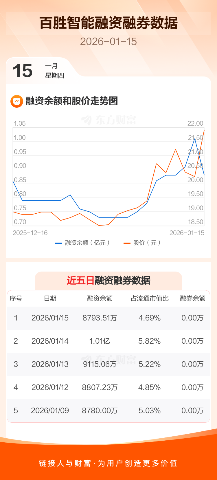 交易所最新数据显示,百胜智能于2026年1月15日获融资买入1620.26万元,融资偿还2912.24万元,当日融资净偿还1291.98万元。目前,该股融资余额8793.51万,占流通市值比例为4.69%。