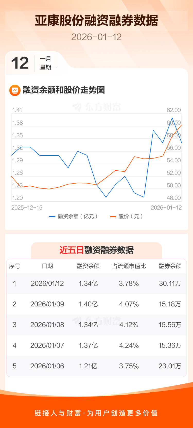交易所最新数据显示,亚康股份于2026年1月12日获融资买入2604.93万元,融资偿还3214.56万元,当日融资净偿还609.63万元。目前,该股融资余额1.34亿,占流通市值比例为3.78%。