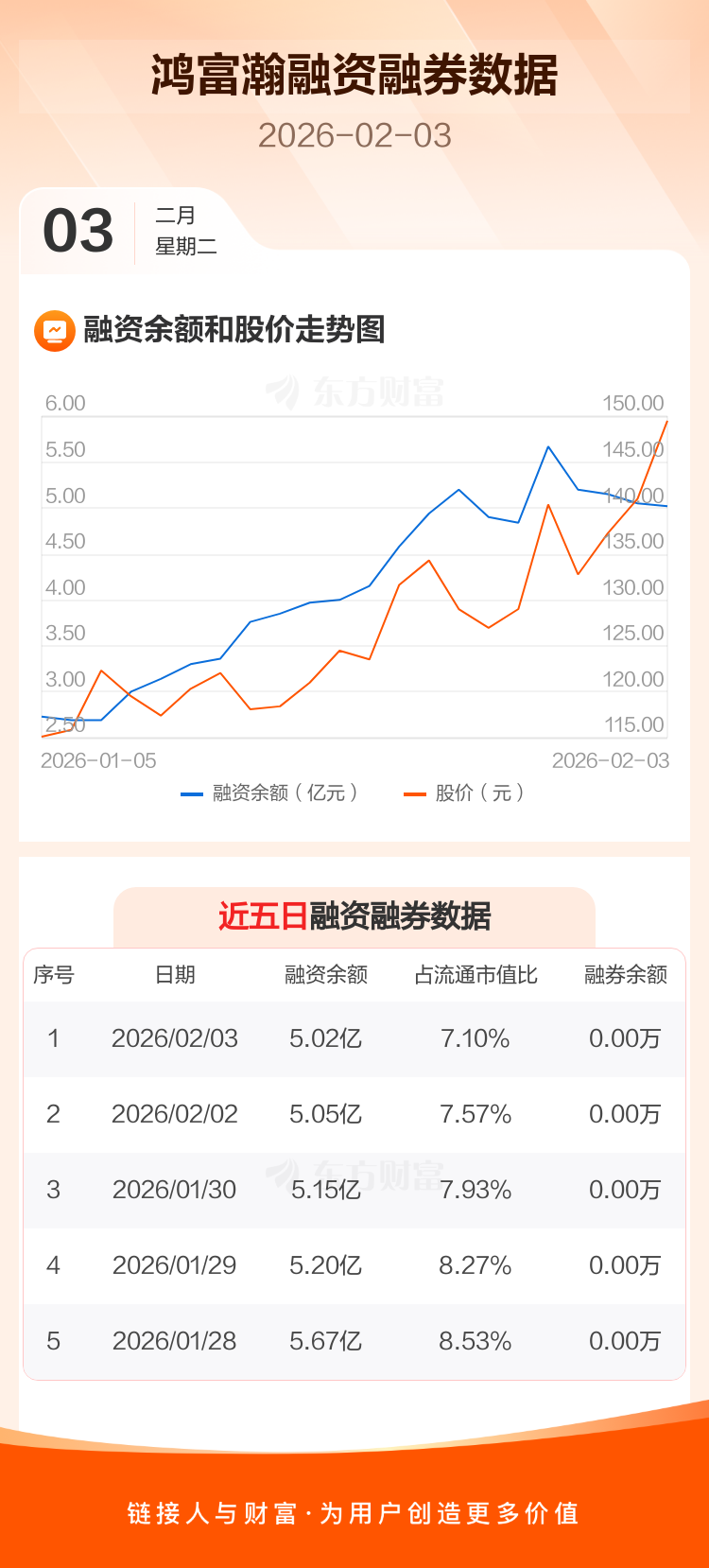 交易所最新数据显示,鸿富瀚于2026年2月3日获融资买入6432.49万元,融资偿还6716.63万元,当日融资净偿还284.14万元。目前,该股融资余额5.02亿,占流通市值比例为7.10%。