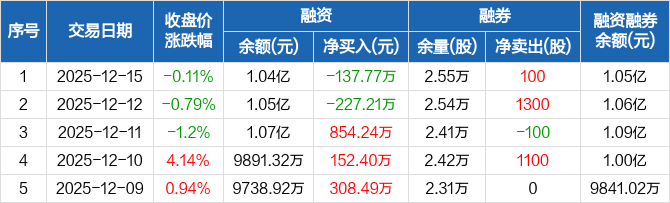 融资方面,当日融资买入627.74万元,融资偿还765.51万元,融资净偿还137.77万元。融券方面,融券卖出100股,融券偿还0股,融券余量2.55万股,融券余额114.93万元。融资融券余额合计1.05亿元。