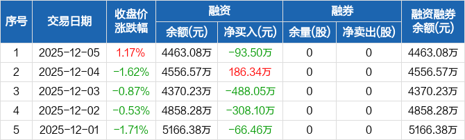 戎美股份:融资净偿还93.5万元,融资余额4463.08万元(12-05)
