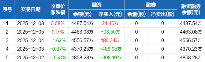 戎美股份:融资净买入24.46万元,融资余额4487.54万元(12-08)