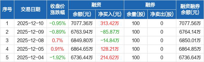 融资方面,当日融资买入466.19万元,融资偿还152.77万元,融资净买入313.42万元。融券方面,融券卖出0股,融券偿还0股,融券余量100股,融券余额1983元。融资融券余额合计7077.56万元。