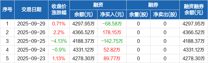 洁雅股份:融资净偿还68.58万元,融资余额4297.95万元(09-29)