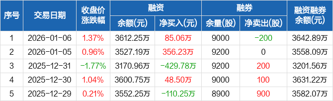 洁雅股份:融资净买入85.06万元,融资余额3612.25万元(01-06)