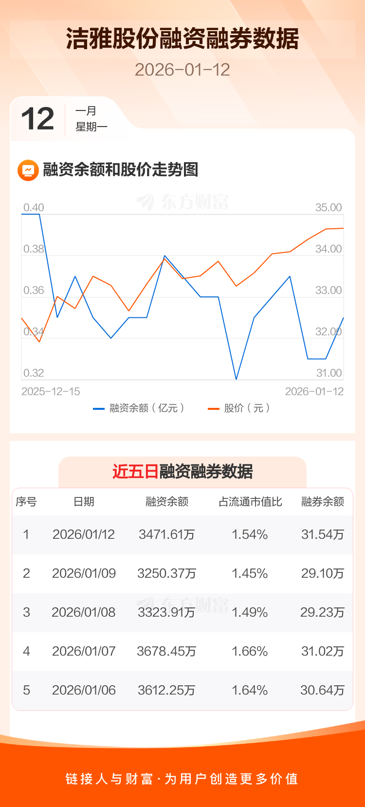交易所最新数据显示,洁雅股份于2026年1月12日获融资买入682.13万元,融资偿还460.89万元,当日融资净买入221.24万元。目前,该股融资余额3471.61万,占流通市值比例为1.54%。