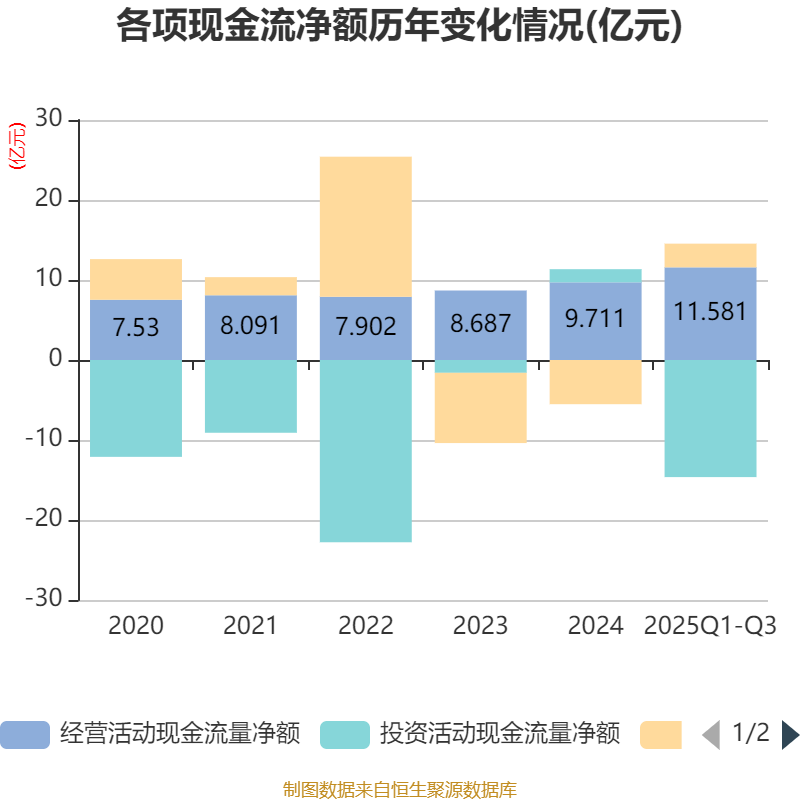 2025年前三季度,公司经营活动现金流净额为11.58亿元,同比增长60.26%;筹资活动现金流净额2.96亿元,同比增加4.85亿元;投资活动现金流净额-14.64亿元,上年同期为2.82亿元。