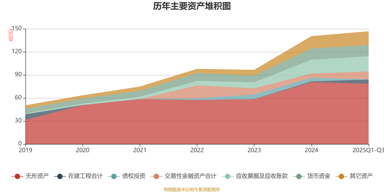 资产重大变化方面,截至2025年三季度末,公司无形资产较上年末减少2.34%,占公司总资产比重下降3.74个百分点;债权投资较上年末减少93.69%,占公司总资产比重下降3.2个百分点;交易性金融资产合计较上年末增加84.79%,占公司总资产比重上升2.99个百分点;在建工程合计较上年末增加414.67%,占公司总资产比重上升2.97个百分点。