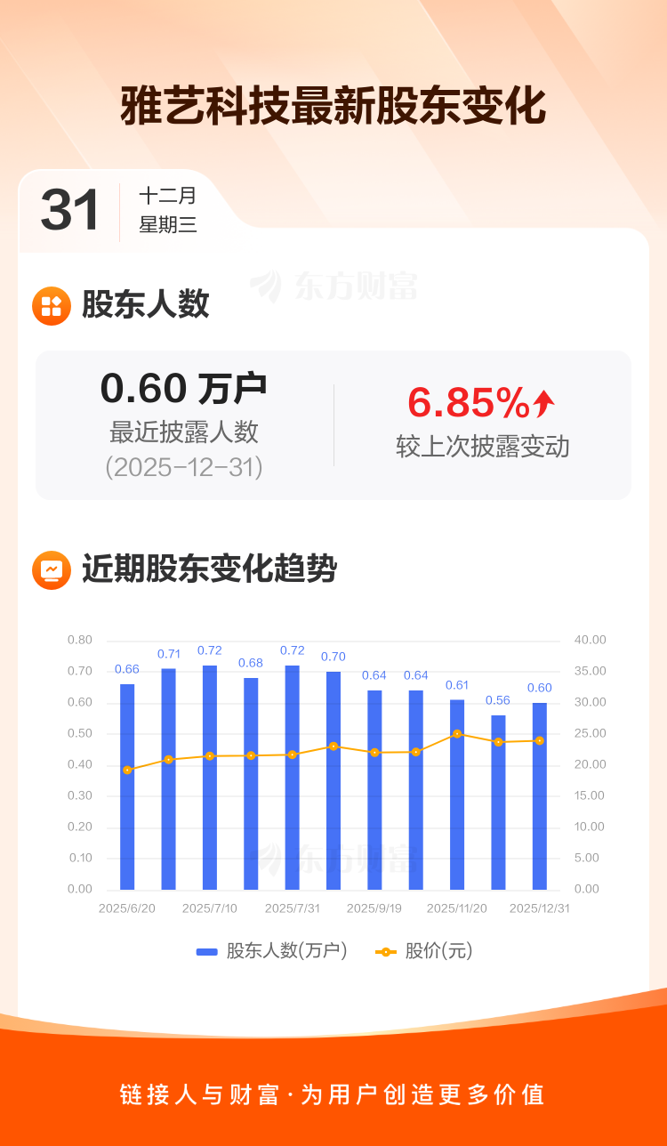 雅艺科技最新披露数据显示,截至12月31日公司股东户数为6034户,较上期(2025年12月19日)增加387户,增幅为6.85%。户均持有流通股数量由上期的9760股下降至9134股,户均持股金额由上期的23.13万元减少至21.85万元。