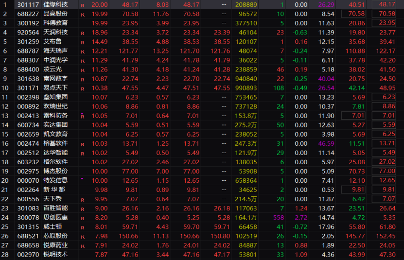 我们一起来看看,人工智能概念股今早的表现。佳缘科技、品高股份、科德教育皆20%涨停。涨停及涨幅超10%个股一度达到了22只。受此带动,沪指涨幅扩大至1%,深证成指一度涨超2%,创业板指一度涨近3%,沪深北三市上涨个股近4800只。