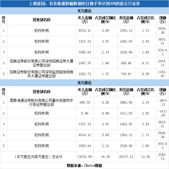 龙虎榜数据显示,今日共7个机构席位出现在龙虎榜单上,分别位列买一、买二、买三、卖二、卖三、卖四、卖五,合计净买入5528.00万元,占龙虎榜净买额的126.04%。除此之外还有赛微电子、海科新源、雷科防务等33只个股榜单上出现了机构的身影,其中12家呈现机构净买入,获净买入最多的是赛微电子,净买额为4.41亿元;21家呈现机构净卖出,其中遭净卖出最高的为南网数字,净卖额为8863.48万元。