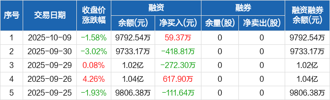 正强股份:融资净买入59.37万元,融资余额9792.54万元(10-09)