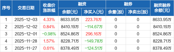 采纳股份:融资净买入223.76万元,融资余额8633.95万元(12-03)