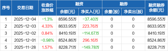 采纳股份:融资净偿还37.4万元,融资余额8596.55万元(12-04)