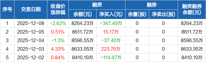 采纳股份:融资净偿还347.49万元,融资余额8264.23万元(12-08)