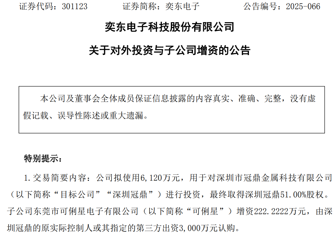 11月26日晚间,奕东电子(301123)公告称,公司拟使用6120万元对深圳市冠鼎金属科技有限公司(以下简称“深圳冠鼎”)进行投资,最终取得其51.00%股权。子公司东莞市可俐星电子有限公司(以下简称“可俐星”)增资222.2222万元,由深圳冠鼎的原实际控制人或其指定的第三方出资3000万元认购。