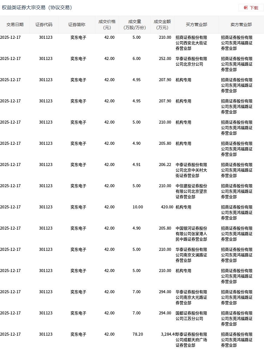 12月17日,奕东电子大宗交易成交157.81万股,成交额6628.02万元,占当日总成交额的4.14%,成交价42元,较市场收盘价52.78元折价20.42%。