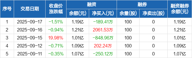 腾亚精工:融资净偿还189.41万元,融资余额1.19亿元(09-17)