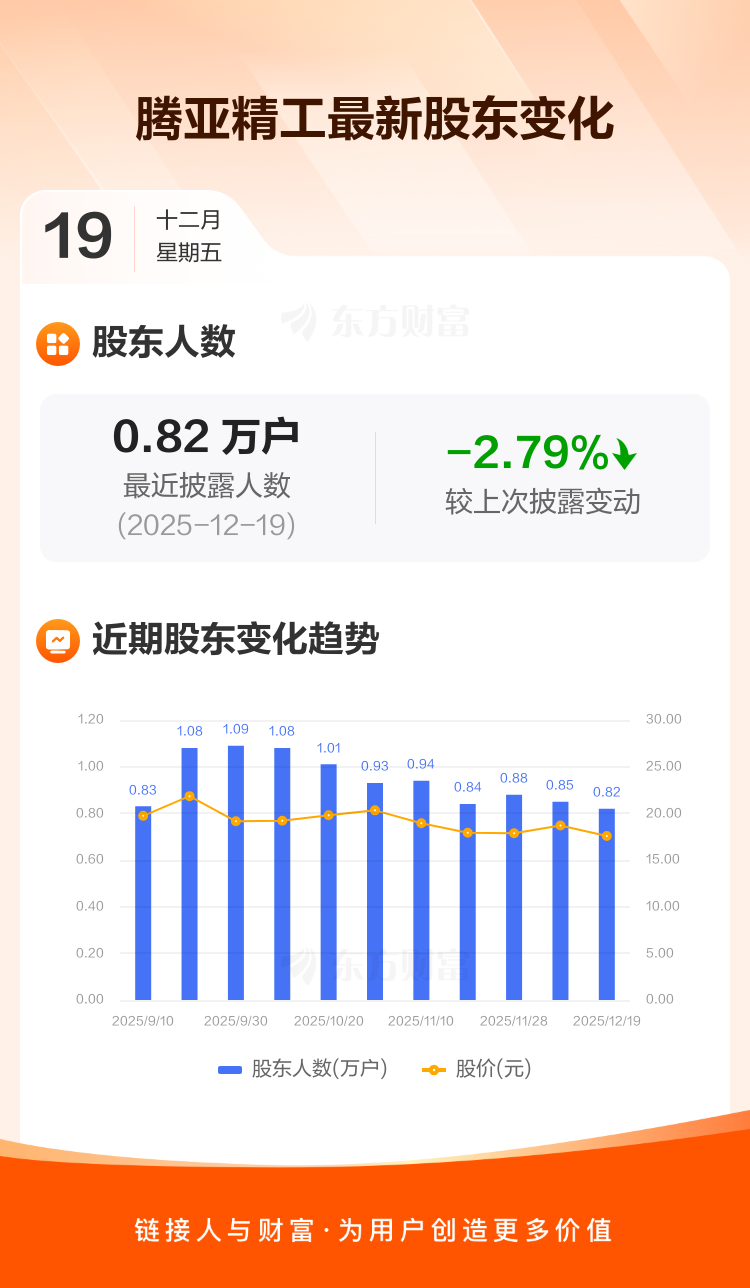 腾亚精工:截至12月19日最新股东户数8221户,较上期减少2.79%