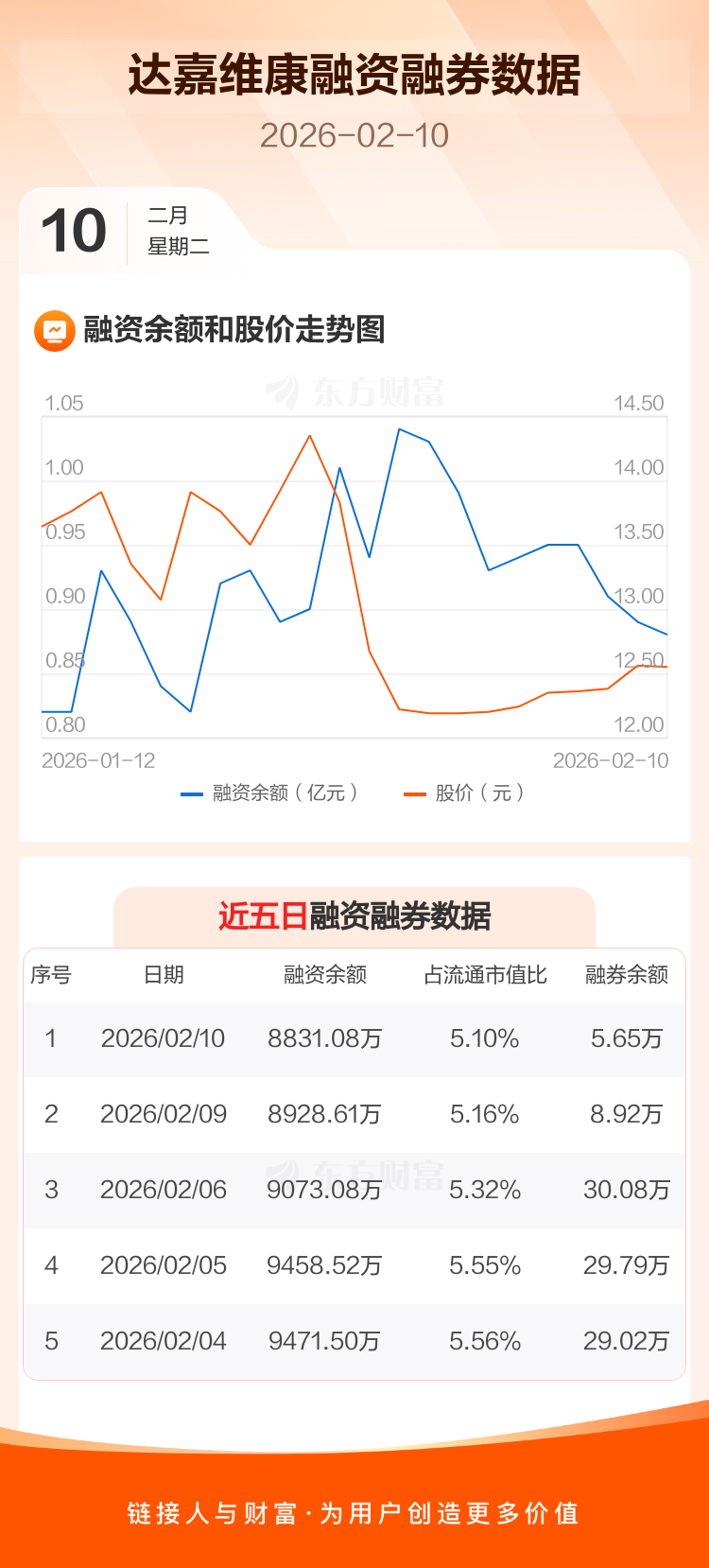 交易所最新数据显示,达嘉维康于2026年2月10日获融资买入450.84万元,融资偿还548.37万元,当日融资净偿还97.53万元。目前,该股融资余额8831.08万,占流通市值比例为5.10%。