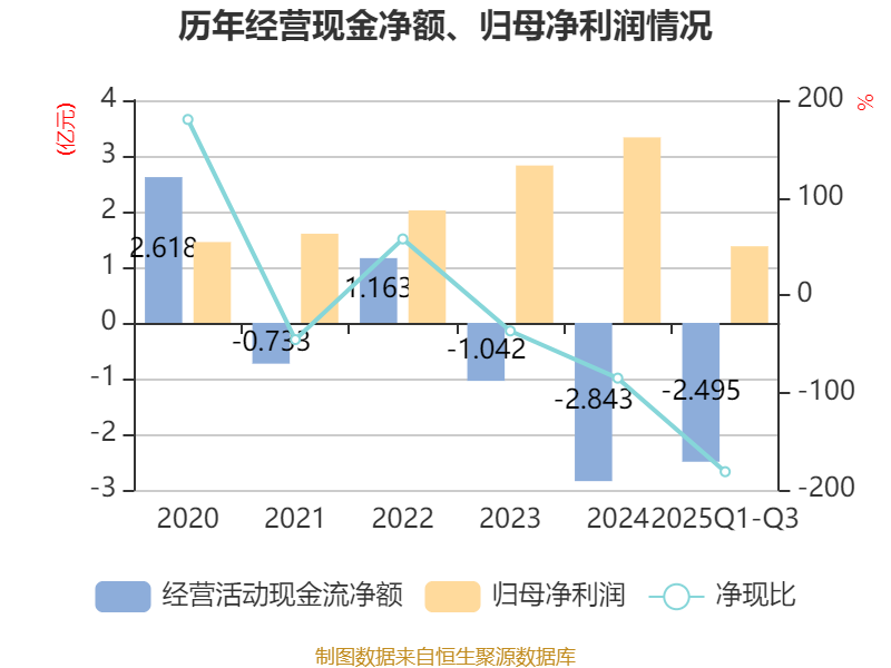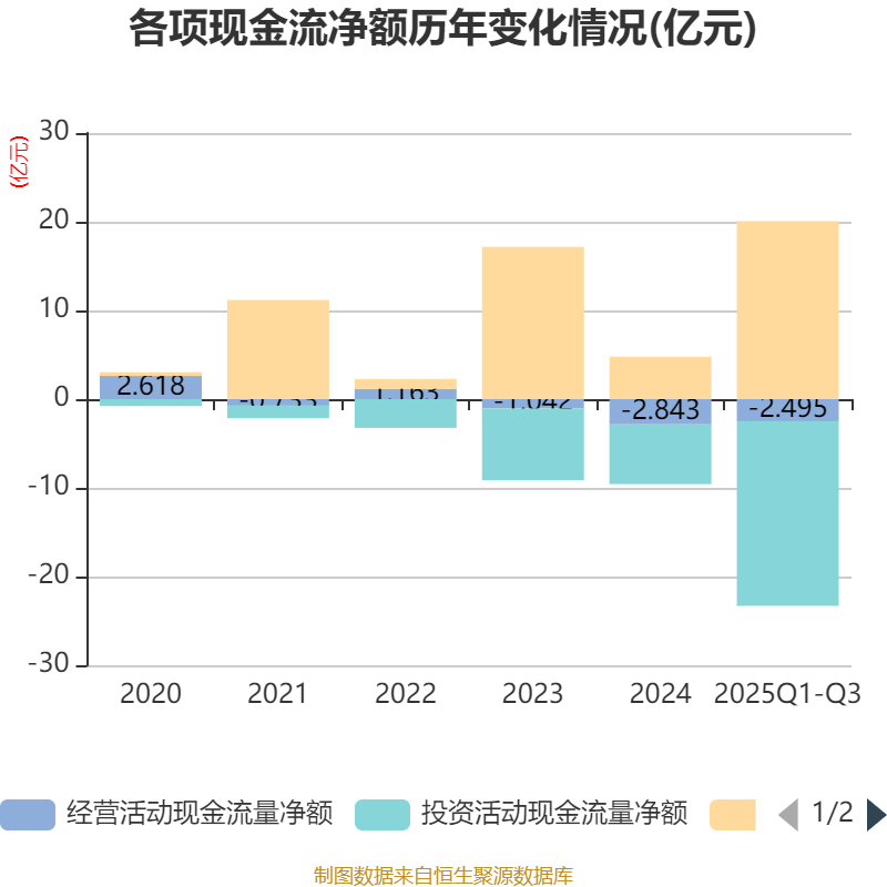 2025年前三季度,公司经营活动现金流净额为-2.5亿元,同比增加1952.74万元;筹资活动现金流净额20.07亿元,同比增加18.48亿元;投资活动现金流净额-20.81亿元,上年同期为-4.87亿元。
