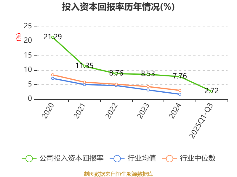 盈利能力方面, 2025年前三季度公司加权平均净资产收益率为4.13%,同比下降2.52个百分点。公司2025年前三季度投入资本回报率为2.72%,较上年同期下降2.02个百分点。
