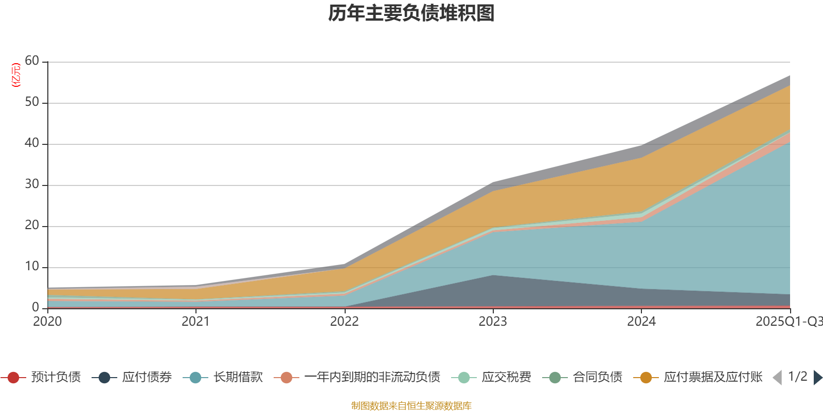 负债重大变化方面,截至2025年三季度末,公司长期借款较上年末增加127.98%,占公司总资产比重上升18个百分点;应付票据及应付账款较上年末减少18.12%,占公司总资产比重下降6.36个百分点;应付债券较上年末减少34.63%,占公司总资产比重下降2.8个百分点;应交税费较上年末减少91.89%,占公司总资产比重下降1.24个百分点。