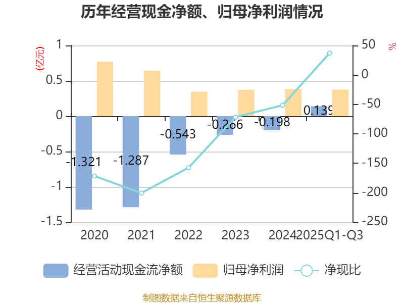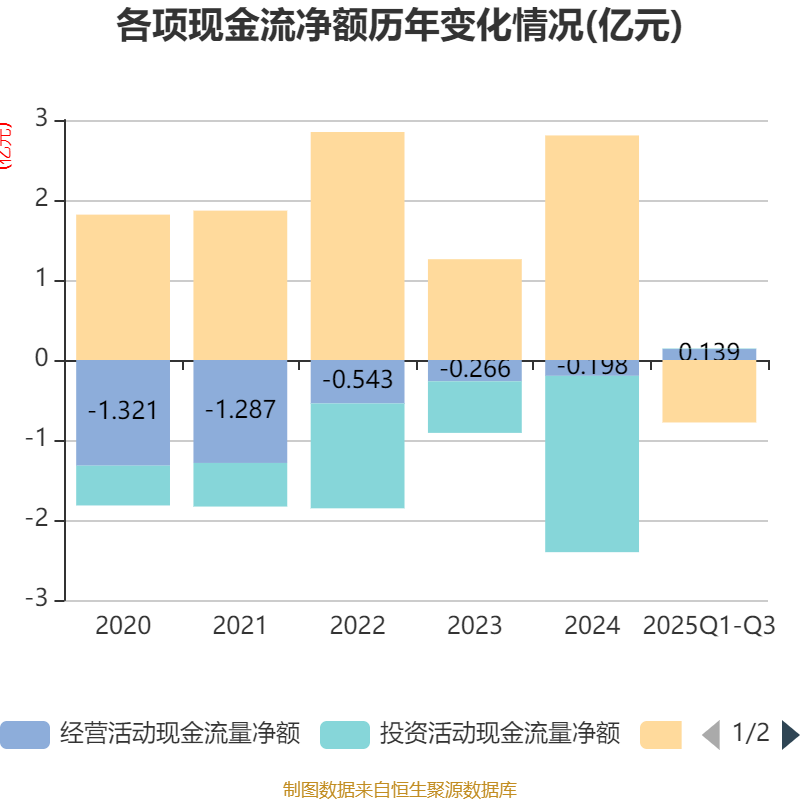 2025年前三季度,公司经营活动现金流净额为1393.04万元,同比增加2558.86万元;筹资活动现金流净额-7806.67万元,同比减少1.49亿元;投资活动现金流净额62.08万元,上年同期为-1.68亿元。