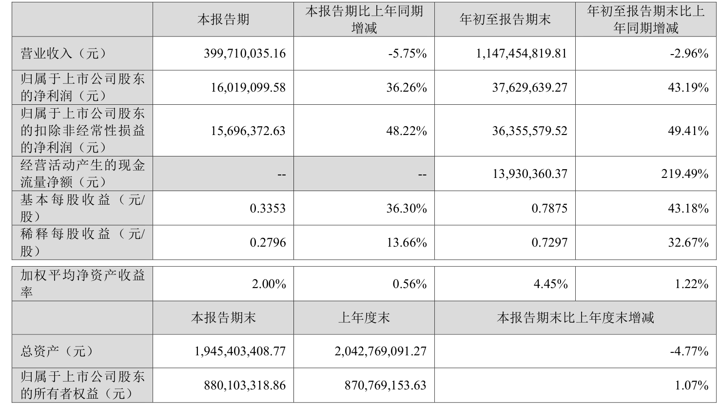 中证智能财讯聚赛龙(301131)10月30日披露2025年第三季度报告。前三季度公司实现营业总收入11.47亿元,同比下降2.96%;归母净利润3762.96万元,同比增长43.19%;扣非净利润3635.56万元,同比增长49.41%;经营活动产生的现金流量净额为1393.04万元,上年同期为-1165.82万元;报告期内,聚赛龙基本每股收益为0.7875元,加权平均净资产收益率为4.45%。