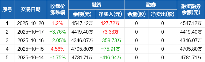金钟股份:融资净买入127.72万元,融资余额4547.12万元(10-20)
