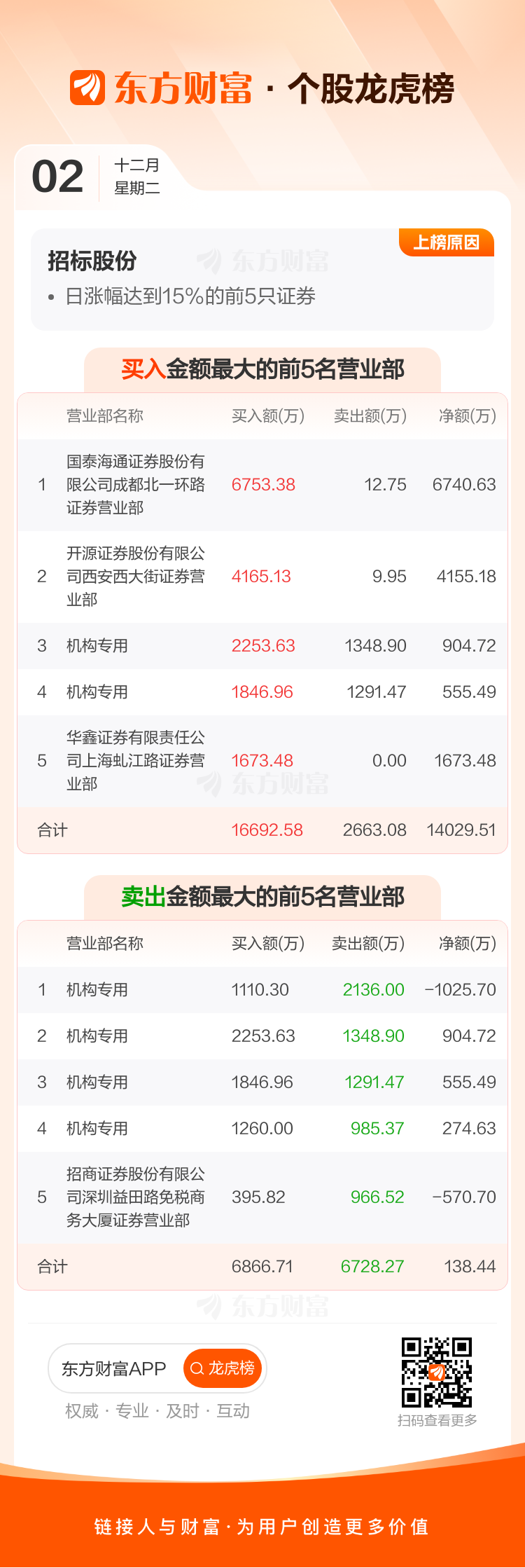 交易所2025年12月2日公布的交易公开信息显示,招标股份因成为日涨幅达到15%的前5只证券上榜。招标股份当日收报19.92元,涨跌幅20.00%,偏离值20.00%,换手率16.80%,成交额8.27亿。