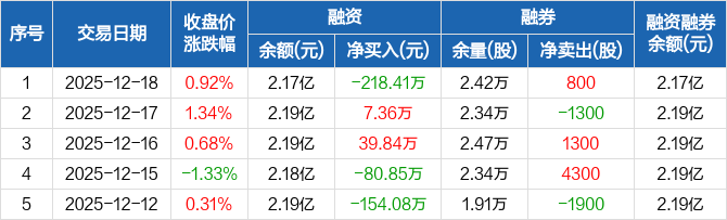 融资方面,当日融资买入653.52万元,融资偿还871.92万元,融资净偿还218.41万元。融券方面,融券卖出800股,融券偿还0股,融券余量2.42万股,融券余额47.92万元。融资融券余额合计2.17亿元。