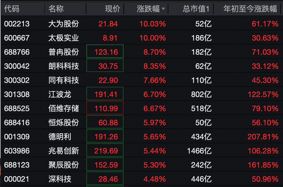 早盘,存储器概念板块涨近4%,大为股份、太极实业涨超10%,兆易创新、德明利、江波龙、同有科技等股涨超5%。