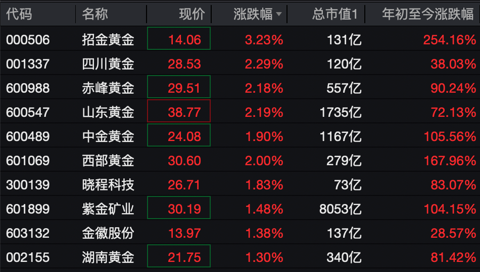 个股方面,招金黄金涨逾3%,四川黄金、赤峰黄金、山东黄金、中金黄金、西部黄金等相关个股纷纷飘红。