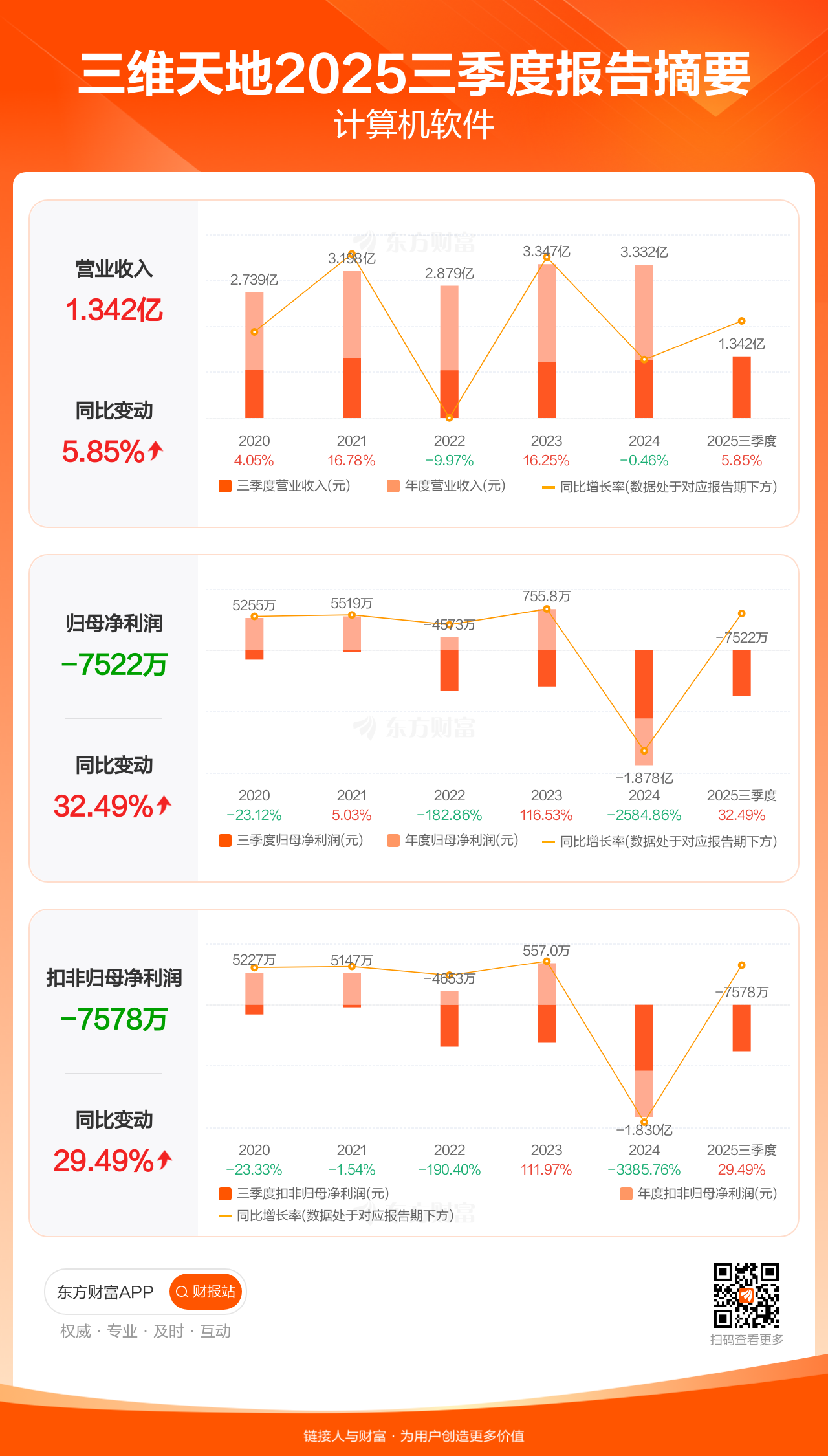三维天地10月30日发布2025年三季报显示,公司前三季实现营业收入1.34亿元,同比增长5.85%;归母净利润-7521.66万元;扣非归母净利润-7578.31万元。
