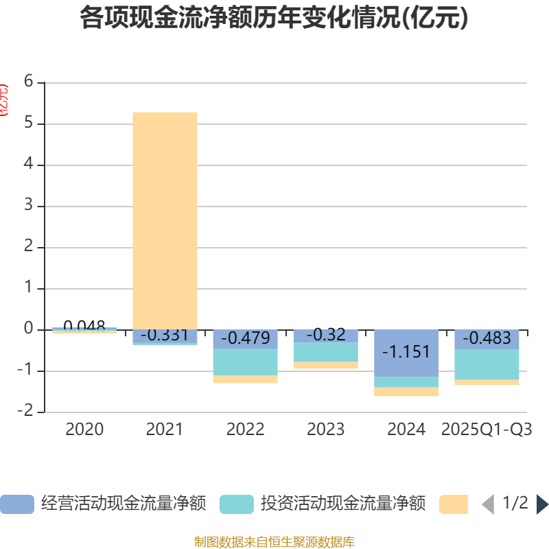 2025年前三季度,公司经营活动现金流净额为-4828.72万元,同比增加9969.25万元;筹资活动现金流净额-1208.1万元,同比增加673.14万元;投资活动现金流净额-7437.4万元,上年同期为-2156.41万元。