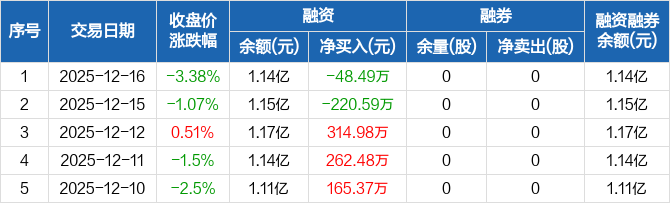 唯万密封:融资净偿还48.49万元,融资余额1.14亿元(12-16)