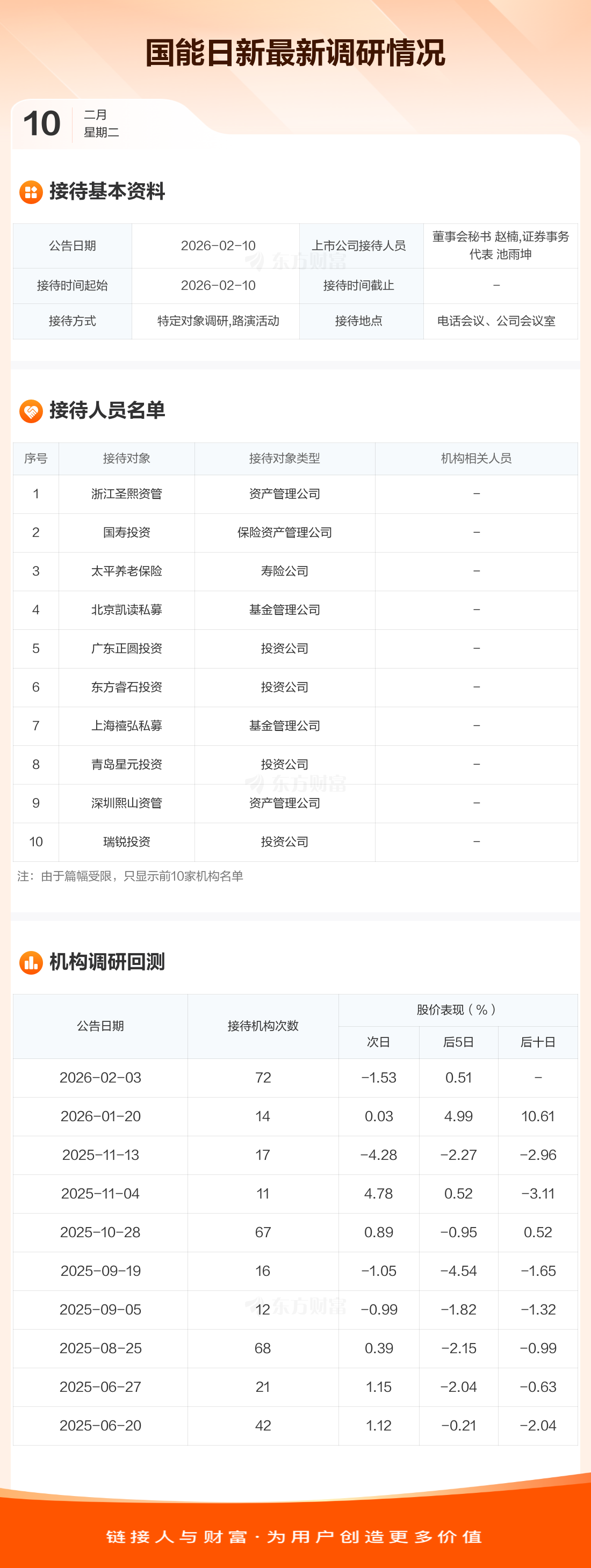 国能日新2月10日公告称,2月10日接待浙江圣熙资管等39家机构调研。接待人员包括董事会秘书 赵楠,证券事务代表 池雨坤。