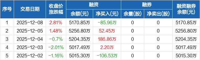 逸豪新材:融资净偿还85.96万元,融资余额5170.85万元(12-08)