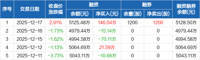 逸豪新材:融资净买入146.04万元,融资余额5125.48万元(12-17)