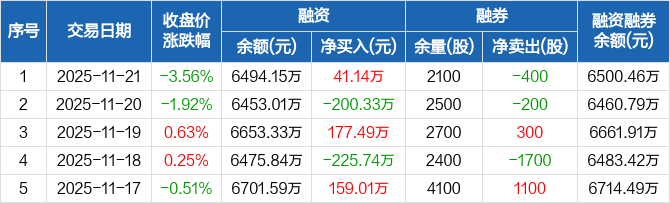 融资方面,当日融资买入354.87万元,融资偿还313.73万元,融资净买入41.14万元。融券方面,融券卖出200股,融券偿还600股,融券余量2100股,融券余额6.31万元。融资融券余额合计6500.46万元。