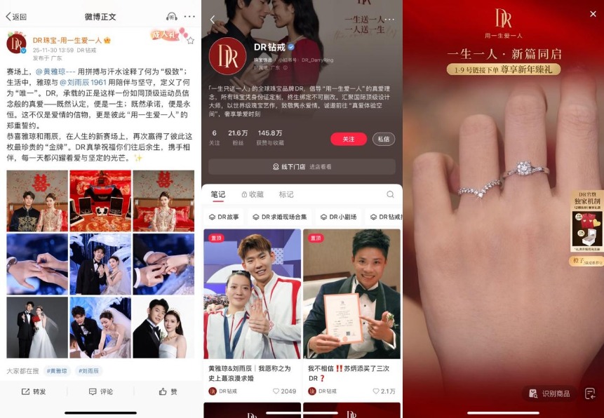 市场给出了最直接的反馈。弗若斯特沙利文报告显示,按2020-2022年全球市场求婚钻戒销量计算,DR是全球第一的钻戒品牌。截至2025年上半年,该品牌在微博、微信、抖音、快手、小红书等国内新媒体平台粉丝超过3000万,其在TikTok等海外社交平台的粉丝也逼近百万。