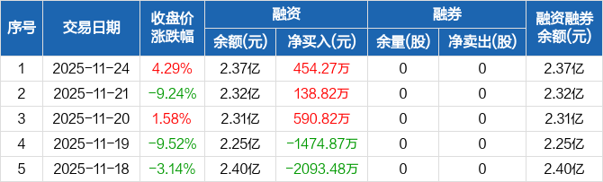 融资方面,当日融资买入1833.93万元,融资偿还1379.66万元,融资净买入454.27万元,连续3日净买入累计1183.9万元。融券方面,融券卖出0股,融券偿还0股,融券余量0股,融券余额0元。融资融券余额合计2.37亿元。