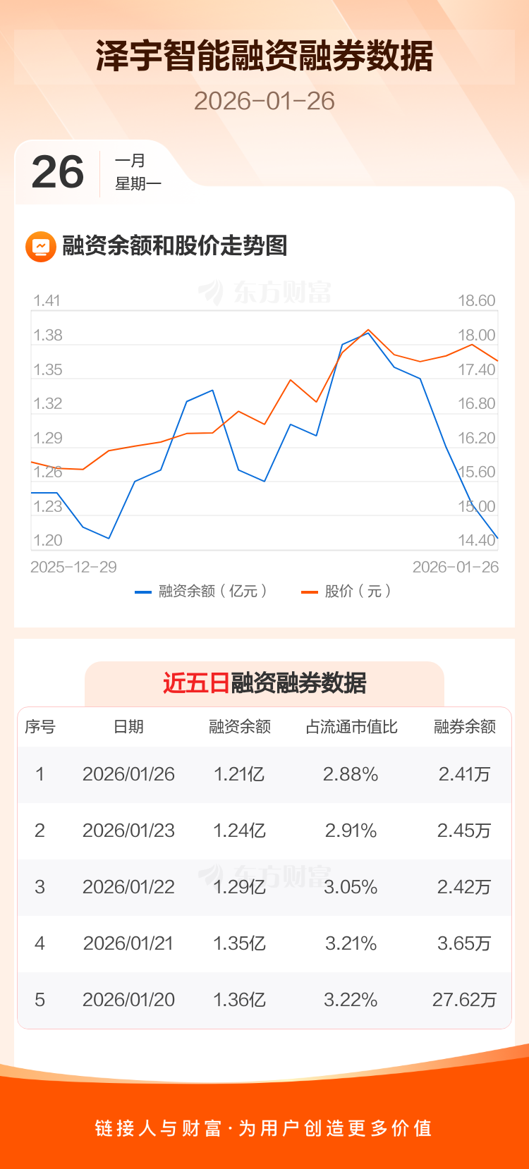 交易所最新数据显示,泽宇智能于2026年1月26日获融资买入875.84万元,融资偿还1184.52万元,当日融资净偿还308.68万元。目前,该股融资余额1.21亿,占流通市值比例为2.88%。