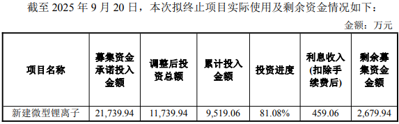 (二)“新建微型锂离子电池及精密零部件生产项目”募集资金已基本使用完毕,截至2025年9月20日,剩余未使用募集资金(不含利息收入等)2,220.88万元,金额较小,占该募投项目原计划投入资金的18.92%、占公司本次募集资金净额的5.11%,占比较低。为更合理地配置资源,决定终止使用募集资金投资该募投项目,并将剩余募集资金永久补充流动资金,用于公司日常生产经营活动。