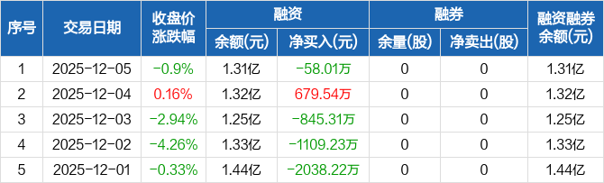 凯旺科技融资融券信息显示,2025年12月5日融资净偿还58.01万元;融资余额1.31亿元,较前一日下降0.44%。